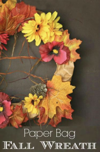 Gently fold and roll the edges outward, working your way around the opening as you go. Use your glue gun to secure any loose edges in place. Have your child glue the artificial leaves and flowers around the paper bag. Finish by loosely winding a few lengths of raffia around your wreath. To make your paper bag fall wreath, you’ll need: