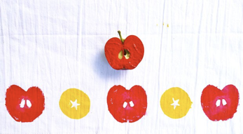 Lay down an old tablecloth or newspaper and have kids pain the half-apples with a paintbrush. The color is up to you, but since it’s fall we decided to go with red and yellow. Place the apple pain-side down on the tea towel and press down very firmly. Carefully lift the apple straight up. And there you have it! Autumn Apple Prints!