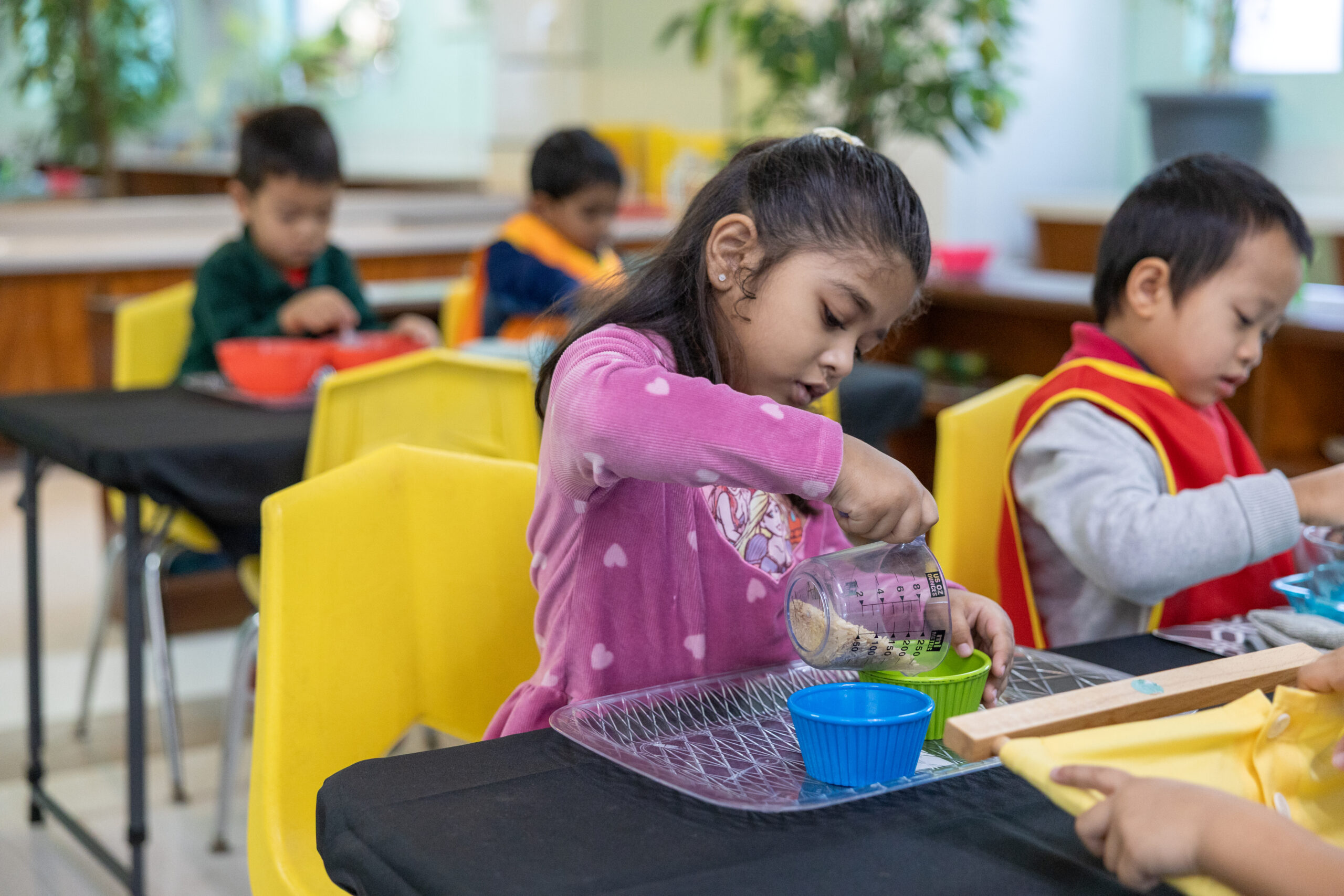 Children spend their day engaged in classroom lessons, hands-on activities, creative work, and time for movement and outdoor play. Some work independently, others alongside classmates, supported by teachers who guide transitions and keep the day moving steadily.